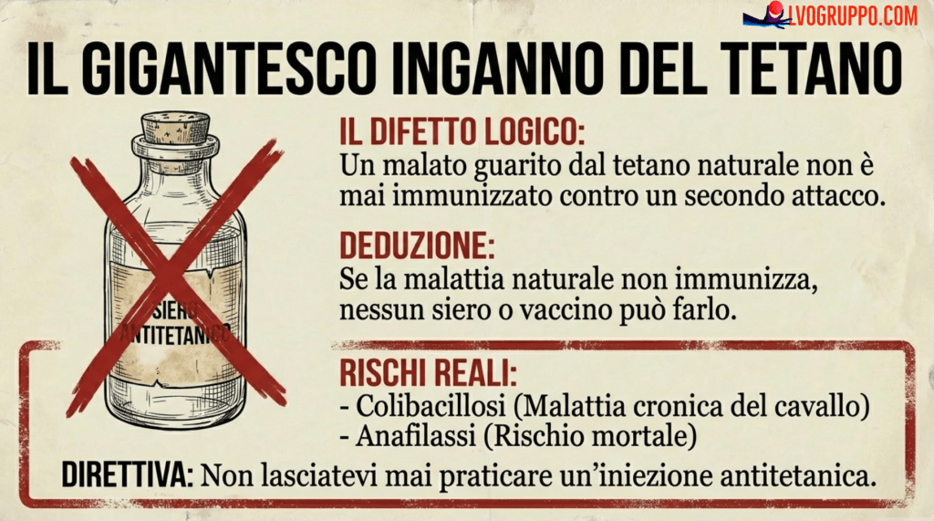 Particolarmente aspra è la critica al trattamento antirabbico e al siero antitetanico, definiti entrambi “giganteschi inganni”. Per l’antitetanica, Tissot avanza un’argomentazione biologica: poiché la malattia stessa (il tetano) non conferisce immunità contro successive infezioni, sarebbe biologicamente impossibile che un siero o un vaccino possano fornire protezione. Si tratta, sostiene, di un “falso dogma pastoriano”.