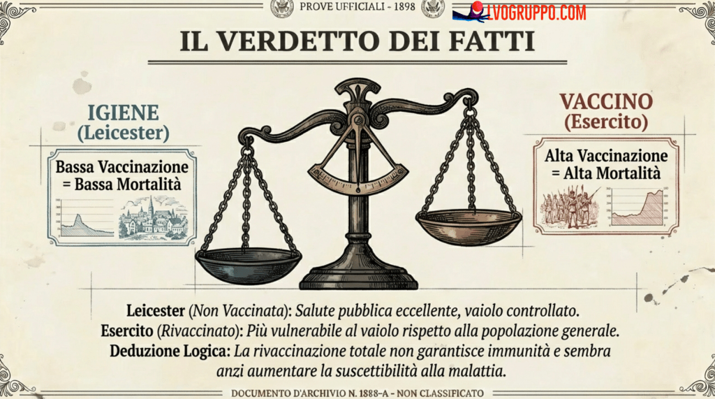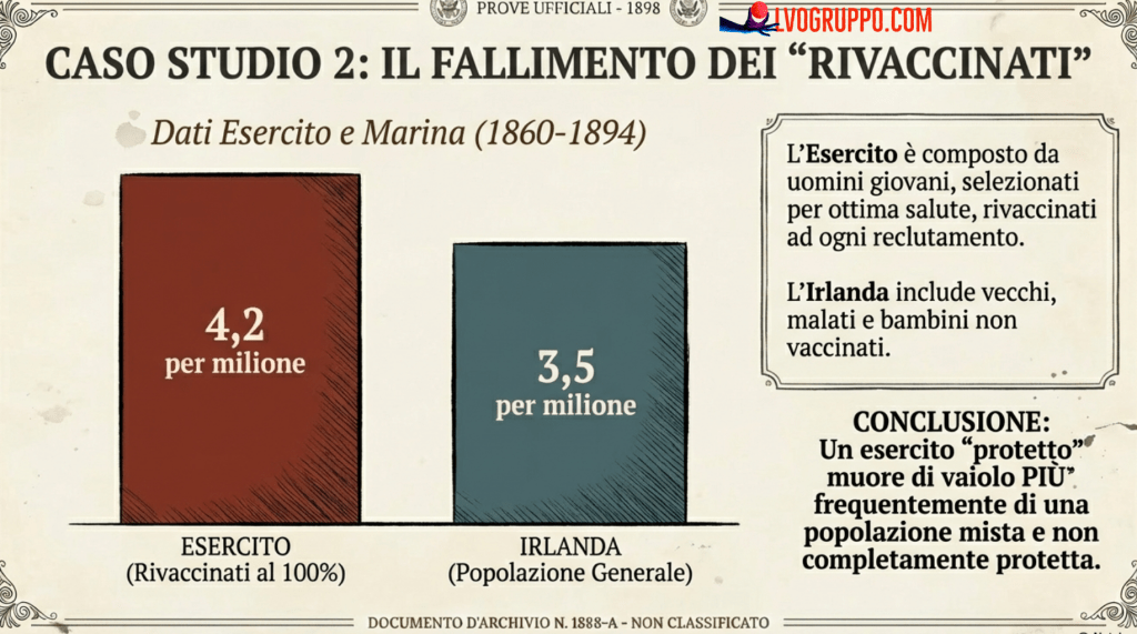 Ma l’evidenza più devastante contro la vaccinazione, secondo Wallace, proveniva da quello che avrebbe dovuto essere il suo trionfo più evidente: l’esercito e la marina britannici. Dal 1860 al 1894, ogni recluta era stata vaccinata o rivaccinata sistematicamente. Questi erano giovani uomini selezionati per la salute, sottoposti alla “protezione” più completa possibile secondo i canoni della teoria vaccinale.
