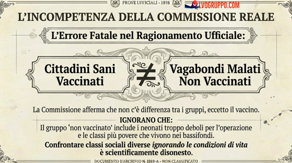 Il caso più eclatante riguardava l’affermazione della Commissione che i gruppi di vaccinati e non vaccinati fossero identici in tutti gli aspetti tranne la vaccinazione stessa. I Commissari scrissero: “Coloro, quindi, che sono selezionati come persone vaccinate potrebbero altrettanto bene essere tante persone scelte a caso dal numero totale attaccato. Per quanto riguarda qualsiasi connessione con l’incidenza di, o la mortalità da, vaiolo, la scelta delle persone avrebbe potuto essere fatta altrettanto bene secondo il colore dei vestiti che indossavano.”