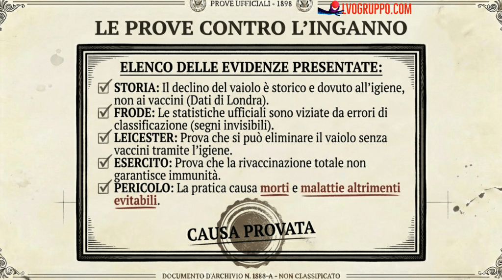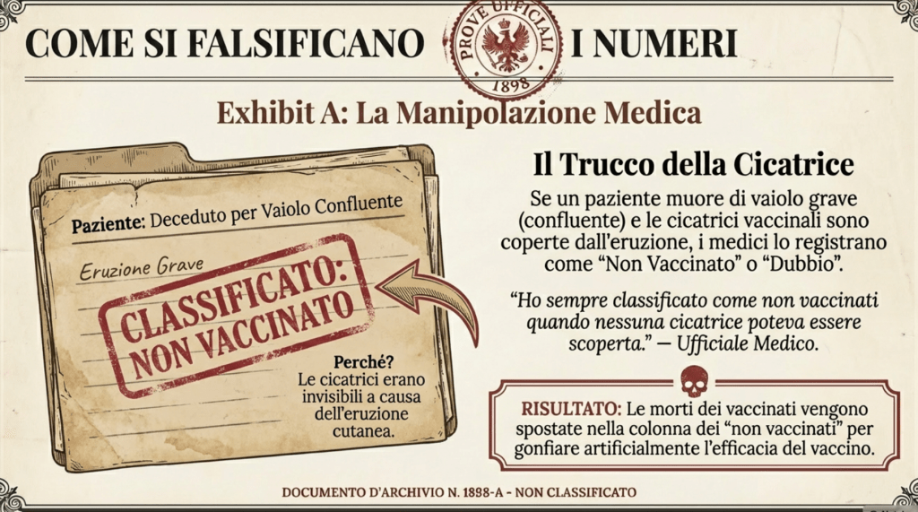 Il protocollo standard, ammesso dagli stessi funzionari medici, era categorico: se un paziente morto di vaiolo non mostrava cicatrici visibili di vaccinazione, veniva automaticamente classificato come “non vaccinato” – anche se esistevano registri ufficiali che dimostravano che era stato vaccinato. Come spiegò candidamente un funzionario medico: “Ho sempre classificato come ‘non vaccinati’ quando nessuna cicatrice, presumibilmente derivante dalla vaccinazione, poteva essere scoperta… Da un punto di vista prognostico e statistico, è meglio, e penso necessario, classificarli come non vaccinati.”