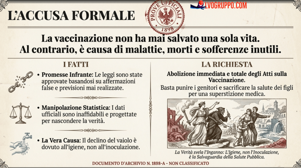 “I successivi Atti sulla Vaccinazione”, scrisse, “furono approvati mediante allegazioni che erano del tutto false, e promesse che sono state tutte non mantenute.”