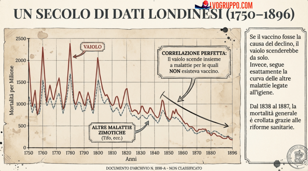 I dati di Londra mostravano che dal 1760 al 1896, il vaiolo seguiva esattamente gli stessi pattern di aumento e diminuzione di tutte le altre malattie zimotiche (febbri tifoidi, colera, ecc.) e della mortalità generale. Quando miglioravano le condizioni sanitarie – migliore approvvigionamento idrico, migliore gestione dei rifiuti, meno sovraffollamento – tutte le malattie diminuivano insieme. Quando peggioravano, tutte aumentavano insieme.