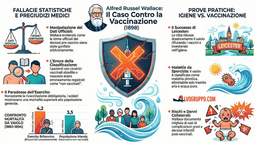 Wallace iniziò la sua indagine come molti scienziati onesti: con la presunzione che le autorità mediche stessero dicendo la verità. Ciò che scoprì lo lasciò sbigottito. Nel corso della sua analisi dei Rapporti Ufficiali della Commissione Reale sulla Vaccinazione e delle statistiche del Registrar-General britannico, Wallace documentò una serie di falsificazioni così palesi che definirle “errori” sarebbe un atto di generosità immotivata.