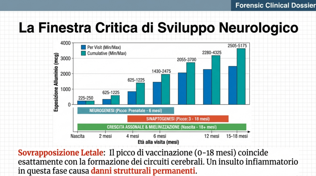I dati mostrano che l’esposizione cumulativa raggiunge livelli di 2.055-3.700 mcg entro i 6 mesi e 2.505-5.175 mcg entro i 15-18 mesi. Questa tempistica coincide precisamente con le finestre critiche per la sinaptogenesi e la potatura sinaptica nelle cortecce associative, nonché con i periodi di rapida mielinizzazione delle vie cerebrali lunghe. La sincronia tra esposizione e vulnerabilità developmental rappresenta un elemento critico per comprendere come l’alluminio adiuvante possa interferire con lo sviluppo neurologico.