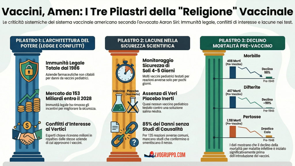 Nota: Questo articolo è una sintesi del libro “Vaccines, Amen: The Religion of Vaccines” di Aaron Siri (2025). Le affermazioni contenute riflettono le argomentazioni dell’autore e sono supportate dalle fonti citate. Si invita il lettore a consultare le fonti originali per una valutazione indipendente.