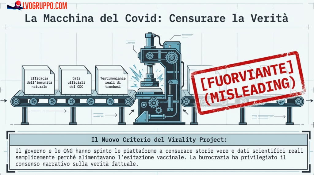 Il Virality Project richiedeva esplicitamente la censura di storie vere sugli effetti collaterali dei vaccini, non perché fossero false, ma perché il loro fatto di essere vere non impediva che potessero scoraggiare la vaccinazione. È la certificazione documentata di un sistema in cui la verità è sacrificabile se risulta scomoda per gli obiettivi di policy: il fatto che qualcosa sia accaduto realmente non basta per permetterne la discussione pubblica, se qualcuno decide che sarebbe meglio che non fosse accaduto.