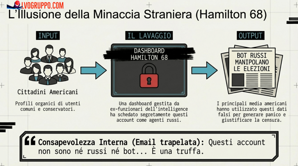 Questa scelta trasformò Hamilton 68 in uno strumento di persecuzione politica. Per anni, giornalisti e politici citarono la dashboard per etichettare come “agenti russi” cittadini che semplicemente esercitavano il loro diritto di parola su temi controversi. La loro reputazione fu danneggiata, il loro messaggio fu declassato, la loro influenza fu ridotta, tutto sulla base di un documento che le stesse piattaforme che lo implementavano sapevano essere falso. È maccartismo digitale nella sua forma più pura: la lista nera pubblica di dissenzienti, la caccia alle streghe contro coloro che pensavano diversamente, la trasformazione del dissenso in prova di complotto straniero.
