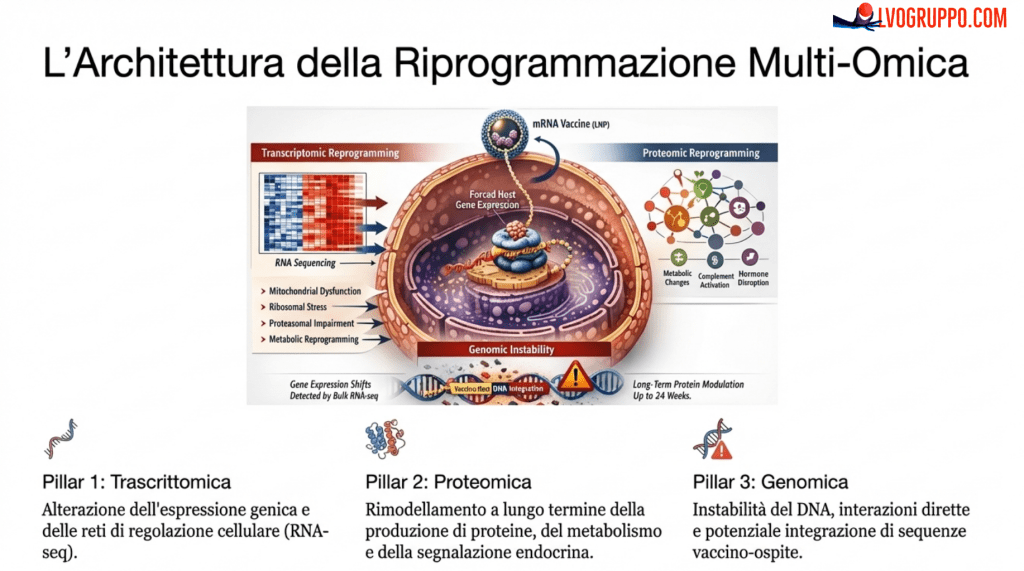 Per sostenere la loro controversa tesi della “riprogrammazione genetica” sistematica, il gruppo di Hulscher si affida pesantemente alla biologia multi-omica. Questo approccio analitico computazionale avanzato rappresenta indubbiamente l’avanguardia della ricerca biomedica contemporanea. Non si limita alla semplice osservazione clinica di un singolo parametro immunologico (come il titolo anticorpale) o di un sintomo, ma integra e correla enormi set di dati provenienti da diversi strati dell’informazione biologica umana: genomica (lo studio dell’intera sequenza del DNA), trascrittomica (lo studio dell’intero profilo dell’RNA messaggero prodotto dalla cellula in risposta a uno stimolo) e proteomica (lo studio quantitativo dell’insieme delle proteine espresse e circolanti).