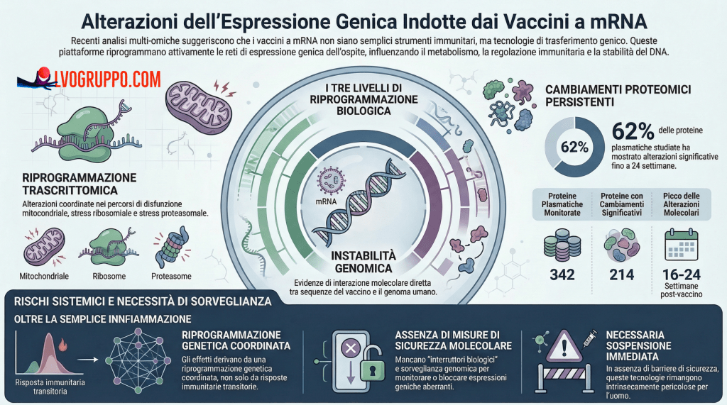 La medicina moderna si fonda su narrazioni consolidate, modelli esplicativi che permettono di comprendere, interpretare e gestire la straordinaria complessità biologica dell’essere umano. Per lungo tempo, la narrazione prevalente ha presentato i vaccini a RNA messaggero (mRNA) come semplici, eleganti strumenti di precisione, progettati per un unico, circoscritto scopo: istruire temporaneamente il sistema immunitario a riconoscere una proteina specifica, la proteina Spike del SARS-CoV-2. Tuttavia, l’emergere di nuove e sofisticate analisi “multi-omiche” — un approccio integrato e ad alta risoluzione che combina genomica, trascrittomica e proteomica — suggerisce che la realtà biologica sottostante l’azione di questi farmaci potrebbe essere sensibilmente più profonda, sfaccettata e complessa di quanto inizialmente ipotizzato dai modelli teorici di base [1]